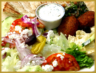 Agurk, tomat, løg, oliven, persille, olivenolie og feta.