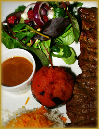 Mild marinerede bankede lammefilét grillet på spyd, samt et spyd grillede hakket oksekød. Serveres med grillet tomat, sauce og safranris.